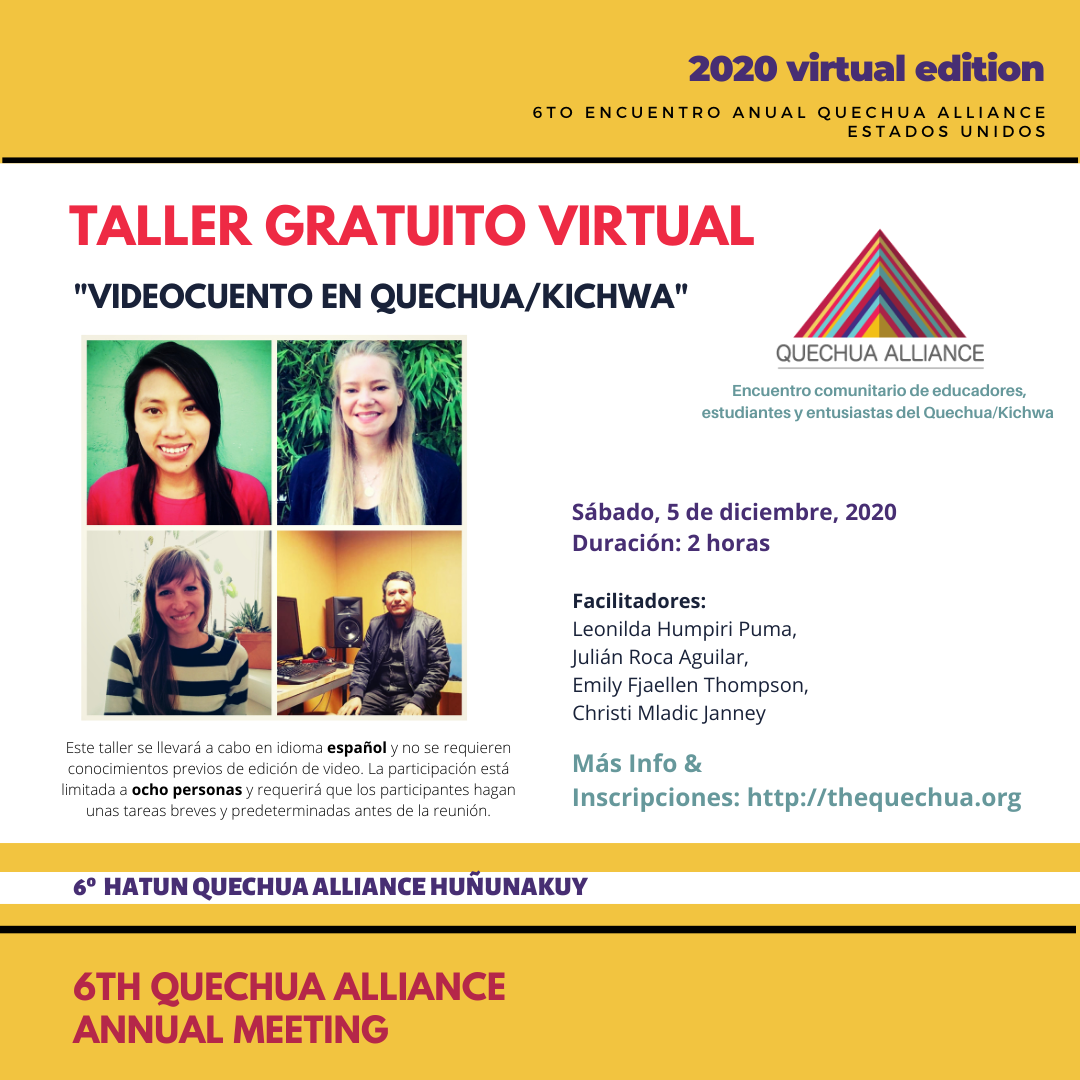 Le invitamos a participar en un taller especial de dos horas a través de Zoom, que se realizará aparte de los otros programas de la conferencia. En este taller, los participantes trabajarán con hablantes nativos de quechua y recibirán apoyo técnico mientras elaboran su propio videocuento corto en quechua. Los videocuentos se publicarán en el canal de YouTube de la Alianza Quechua para que todo el mundo los disfruten. Este taller contribuye a la misión de la Alianza Quechua de no solo hablar sobre el quechua, sino también de promover el uso del quechua y el desarrollo material en quechua.